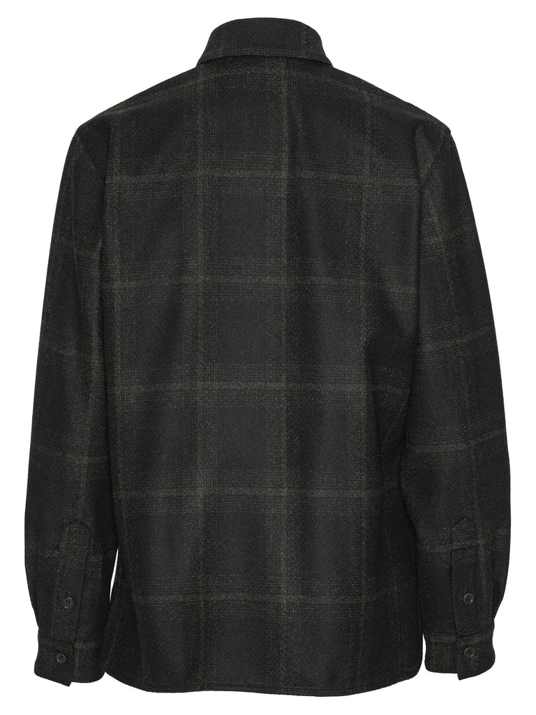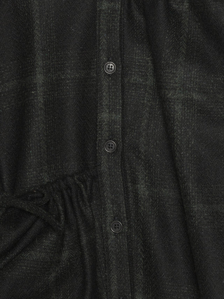- black- soft checks- collar- front button closure- long sleeves- drawstring & ruffle details